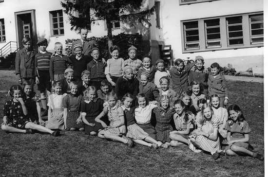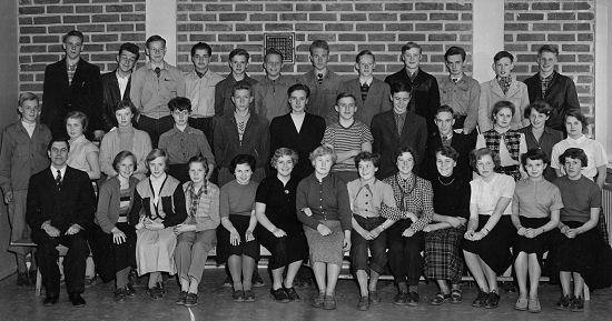 Toivo Toppila seisoo taustalla, hän oli matematiikan opettaja. Huomatkaa kuvan taustalla halkopino! Halkoja käytettiin siihen aikaan koulun lämmittämiseen! Koska I B-luokka oli alakerrassa juuri tuon halkopinon tuntumassa, niin joskus tapahtui niin, että joku luokan ikkunarivissä istuva poika kiipesi ulos ikkunasta ja karkasi tunnilta halkopinon kautta. Nokkelaa, rohkeaa, mutta hauskaa?