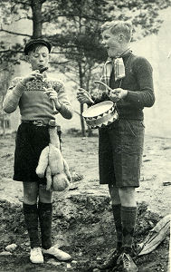 Kun koitti toukokuun loppu (1952) ja me viidesluokkalaiset siirryimme lukioon, niin saimme yhden koulupäivän ajan ottaa hieman rennommin. Silloin pukeuduttiin johonkin "lapselliseen" asuun ja kierreltiin kaduilla ja koulussa "leikkien ja pelleillen". Saimme olla vielä hetken lapsia, sillä - näin oletimme - sitten kuudennella luokalla lukiossa muutuimme kuin taikaiskusta perin aikuisiksi (?). Sivun laatija ja luokkatoverinsa Heikki Mäntylä musisoivat polvihousuissaan ja raahasivat lelujaan . Lapsellisena olo ei kaiketi silloin vielä ollut kovin vaikeatakaan. |