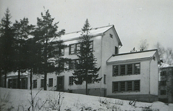 Nuottapolun vanha yhteiskoulu Puistotien jatkeen hiekkatieltä nähtynä talvella 1950. Silloinhan sitä ns. Koneen kolossaalista toimistotaloa sekä sen takana nyt sijaitsevaa ankkalammikkoa ei ollut vielä olemassakaan. Niin se maailma muuttuu