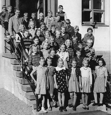 V A-luokan lapselliset omassa porukassaan jossakin luokassa. Eturivissä vasemmalta Eila Valjakka, Marjatta Ypyä ja Juhani Lindgren (ilmeisesti leikkipaloautonsa kanssa); toisessa rivissä Anneli Komulainen, xx?, Eeva-Liisa Sorvari, Maija Järvinen ja Anna-Kaarina Ruutu; kolmannessa rivissä vasemmalla seisomassa Jorma Hintikka, keskellä Tero Kangas, Leena Harlahti ja Ulla Emaus. Aivan takana oikealla Juhani Hyvärinen ja Marja-Liisa Heikinheimo. |