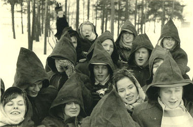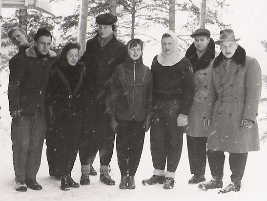 18.2.1956 aamuaikainen VIII A:n penkkareiden jälkeen juhlapaikan porstuan edustalla Lippajärven rannalla. Muutama reipas juhlija urheilutamineissaan (?) lähdössä lenkille. Asko Sivula huppupäänä ja ”Tappari” Rintala varustautuneena huopahatulla vaikka karvalakki olisi ollut paremmin paikallaan. Sankarit vasemmalta: Kerkko Hakulinen, Matti Lampinen, Eeva-Liisa Sorvari, Juhani Hyvärinen, Pirkko Koutsa, Asko Sivula, Ilkka Salomaa ja Tapio Rintala. Eipä ollut meillä silloin Reebokkeja eikä Nikejä saati Luhdan, Rukan, Armanin tai Gantin design-ulkoiluasuja! Niin muuttuu maailma!