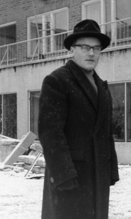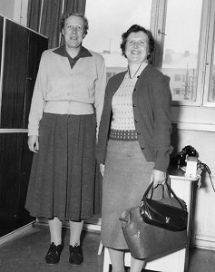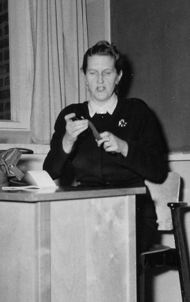 opettajamme - kaikesta päättäen valvomassa välituntia. Mirjam Haavisto, tiukkailmeinen englannin kielen lehtorimme, jolla oli tapana askarrella kynsiensä kanssa tunneillakin ja oikoa tiuhaan tiukahkoa hamettaan! |