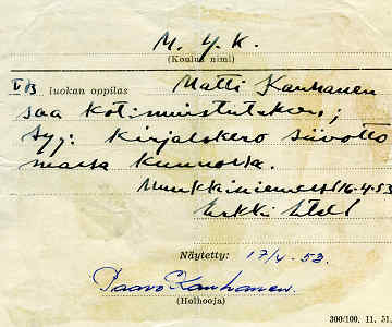 Meitä villejä teinejä ei pidetty kurissa (?) ja nuhteessa vain koulun julkisissa tiloissa ja välitunneilla, vaan opettajien Gestapo iski myös ”intiimitiloihimme” eli koulun ala-aulassa sijaitseviin kirja- yms. privaatti-kamalokeroihimme. Tässä näyte eräästä kotimuistutuksesta. Matti sai sen keväällä 1953 luokanvalvojaltaan Erkki Etelältä, joka oli kyllä muuten herkkä, huumorintajuinen ja mukava mies, mutta aljan, jomman ja trigonometrian hän otti ikävä kyllä haudanvakavasti! |