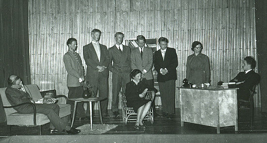 Kohtaus näytelmästä ”Koulun viimeinen luokka”, jossa esiintyvät vasemmalta oikealle Erkki Airaksinen (sohvassa), Pertti Seeve, Juhani Hyvärinen, Kerkko Hakulinen, Tero Kangas, Jaakko Seppälä, Marja-Liisa Rynö ja Antti Renko (koulun rehtori). Istumassa keskellä Anna-Kaarina Ruutu. Hän esittää opettajaa, johon hänen seitsemäsluokkalainen oppilaansa (Pertti S.) tulisesti rakastuu. Tässä kohtauksessa rehtori nuhtelee rakastuneita teinipoikia.