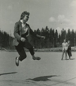 ![]() Täyttä lentoa – Pirjo Ravila uhmaa painovoimaa kuin gaselli. Taustalla luokkamme romanttinen pari: Risto Ruukki ja Anita Hoffman. |
