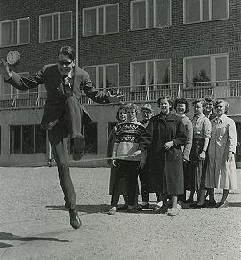 ![]() Matti Kauhanen uskaltautui ainoana miehenä vauhdikkaiden neitosten joukossa näyttämään kuinka maskuliinitkin lentävät. Takana odottaa vuoroaan letka tyttöjä: Laila Aikala, Marja-Liisa Rynö, Ritva Kuusinen, Tuulikki Siitonen, Tuula Vaaranto, Päivi Kelomaa ja Tuula Koskivirta. |