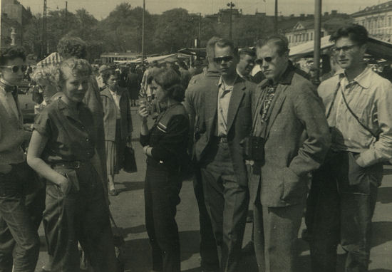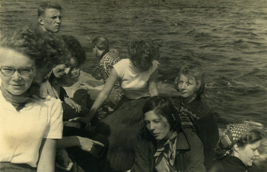 ![]() Matkalla sillä pienellä vuokramoottoriveneellä kohti Suomenlinnaa. Etualalla vasemmalta Mirja Kuusi, Annikki Häkkinen, Kyösti Rousti, valkopuseroinen pörrötukkainen Marjatta Karapää, Anna-Kaarina Ruutu, Marja Heikinheimo ja Maija Järvinen. |