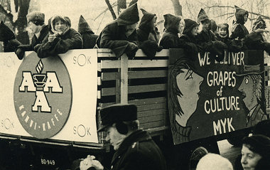 Yhdessä autoistamme luki ”We deliver grapes of culture”. SOK, ”kolmen A'n kahvi”, sponsoroi kaikkia autojamme. Yhden automme kyljessä oli teksti ”Stuidun taonta - maikat kontra tutkintolautakunta”.