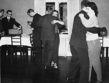 VIII B-luokka vietti 17.-18.2. omat penkkarinsa Tuusulassa Gustavelundin kartanossa, jossa oli samaan aikaan myös jonkin poikakoulun vastaavat kekkerit. Kuvasta näkyy, että tanssilattialla on vauhtia. Tunnistamme ainakin kaksi meidän luokan tyttöä: etualalla on Tuulikki ”Tutu” Siitonen ja taempana Ritva Kuusinen, mutta heidän tanssittajansa ovat tuiki tuntemattomia – liekö ujous iskenyt? Kuten huomataan, myös näissä pippaloissa pojilla on siisti kokopuku, valkoinen paita ja kravatti!