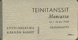 Juhla siis järjestettiin koulumme teinikunnan toimesta tammikuun 14. päivänä 1956. Huomatkaa, että pääsylipun hinta oli 150 silloista eli vuoden 1956 markkaa, joka nykyrahana olisi 3 euroa 60 senttiä! |