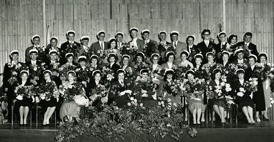 Ylioppilaiksi meidät lakitettiin 31.5.1956. Kuvassa on 44 onnellista koulun juhlasalissa; on siis ilmeistä, että neljä oppilasta reputti kevään kirjoituksissa, mutta he kaikki saivat valkolakkinsa sitten syksyllä.